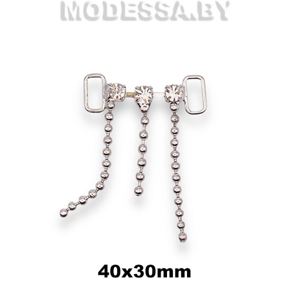 Пришивное украшение металлическое со стразами, артикул: 84 КС. Размер 40х30мм. Ширина отверстия для протяжки 7мм. Модель украшения идеально подходит для декорирования горловины блузок, рубашек или платьев, а также для декоративного оформления сумок, аксессуаров и др.