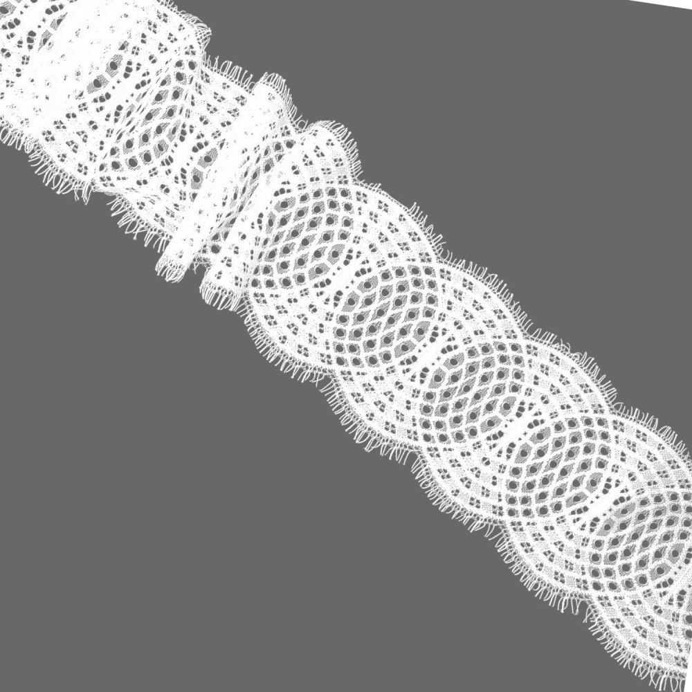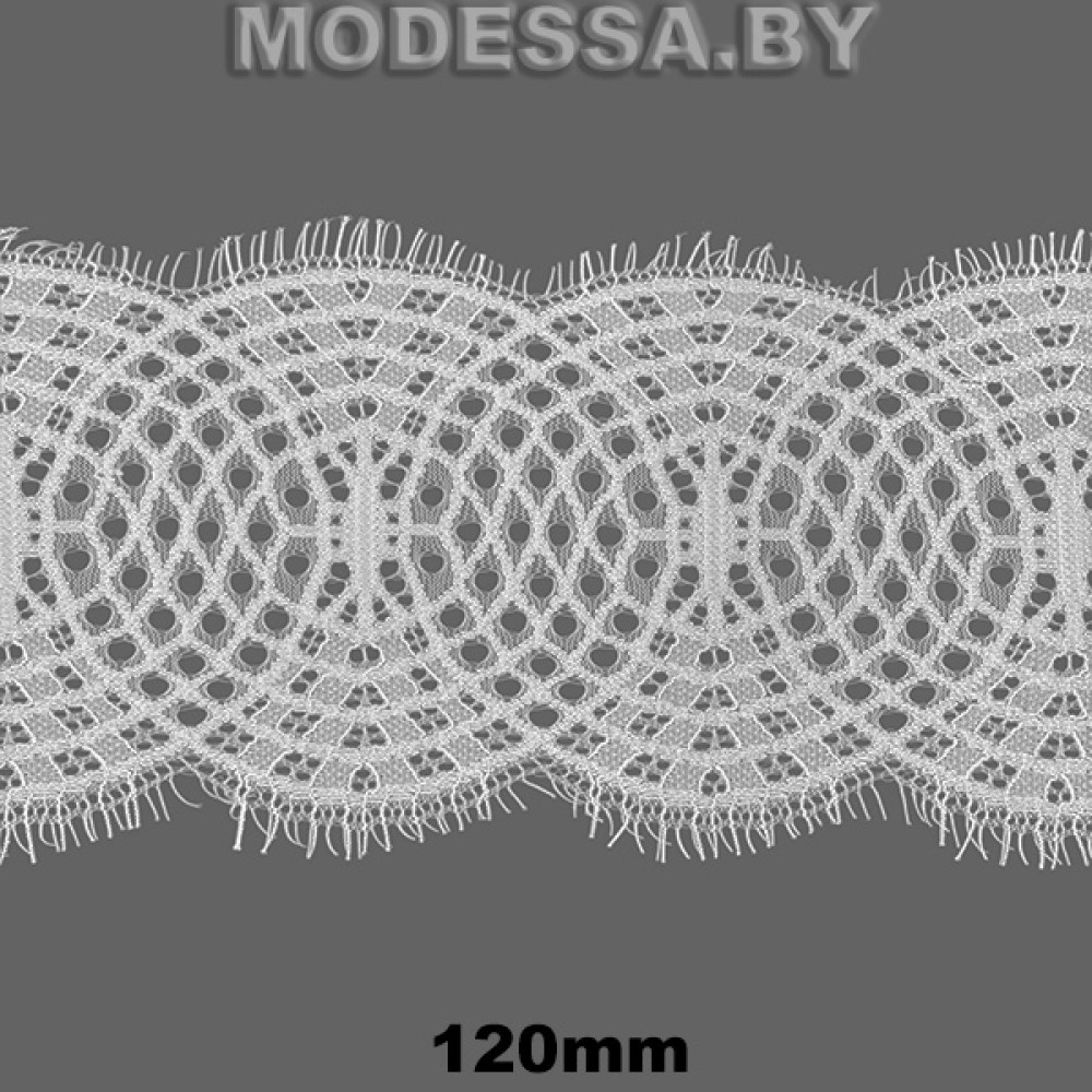 Кружево синтетическое с «ресничками», артикул: А 924. Ширина 120мм, длина 1 ленты — 3м. Кружево очень нежное, тонкое, воздушное, но в то же время прочное. Тянется лишь слегка за счёт переплетения нитей. Чаще всего применяется для украшения нижнего белья, отделки ночных рубашек, сорочек, также можно декорировать низ платьев, рукава и др.
