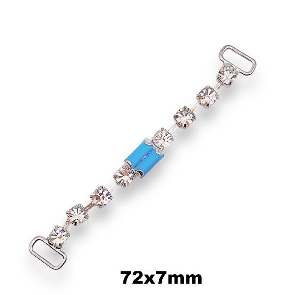 Пришивное украшение металлическое со стразами, артикул: 93. Размер 72х7мм. Ширина отверстия для протяжки 7мм. Модель украшения идеально подходит для декорирования горловины блузок, рубашек или платьев, а также для декоративного оформления сумок, аксессуаров и др.