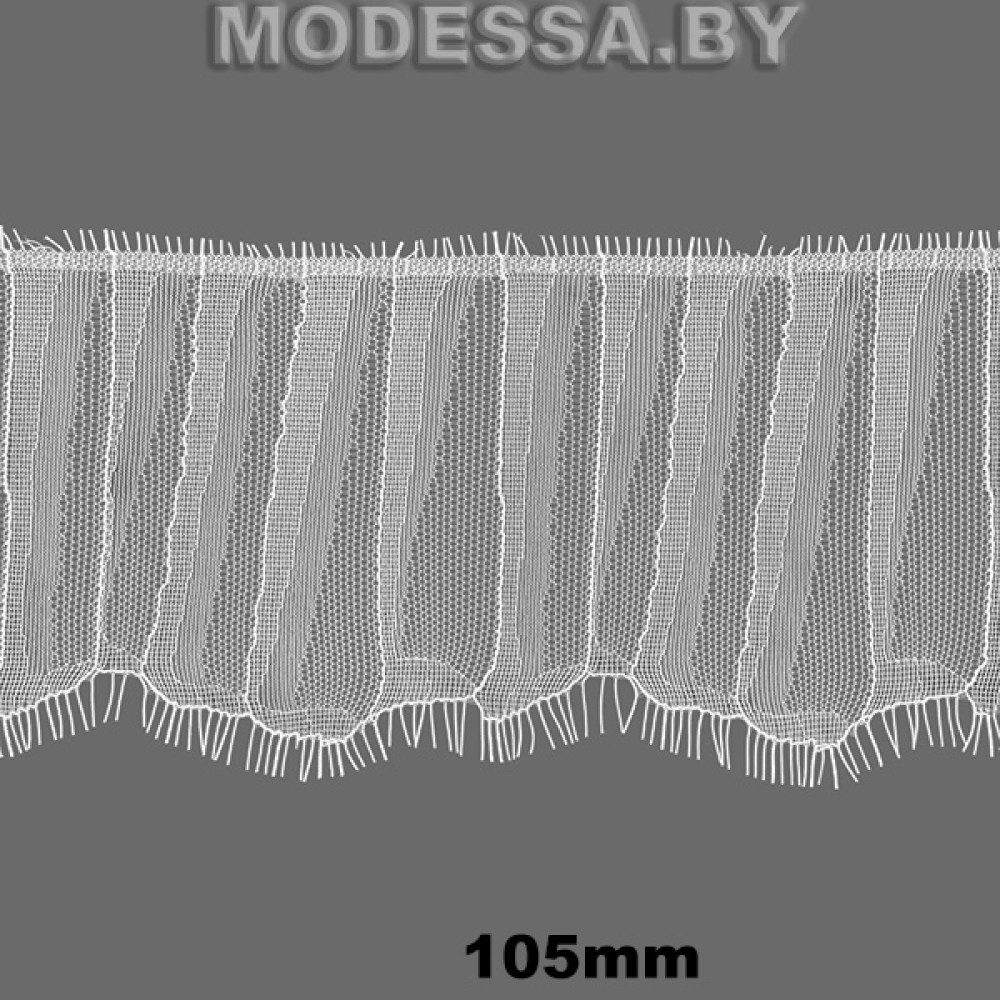 Кружево синтетическое с «ресничками», артикул: 931-1. Ширина 105мм, длина 1 ленты — 3м. Кружево очень нежное, тонкое, воздушное, но в то же время прочное. Тянется лишь слегка за счёт переплетения нитей. Чаще всего применяется для украшения нижнего белья, отделки ночных рубашек, сорочек, также можно декорировать низ платьев, рукава и др.