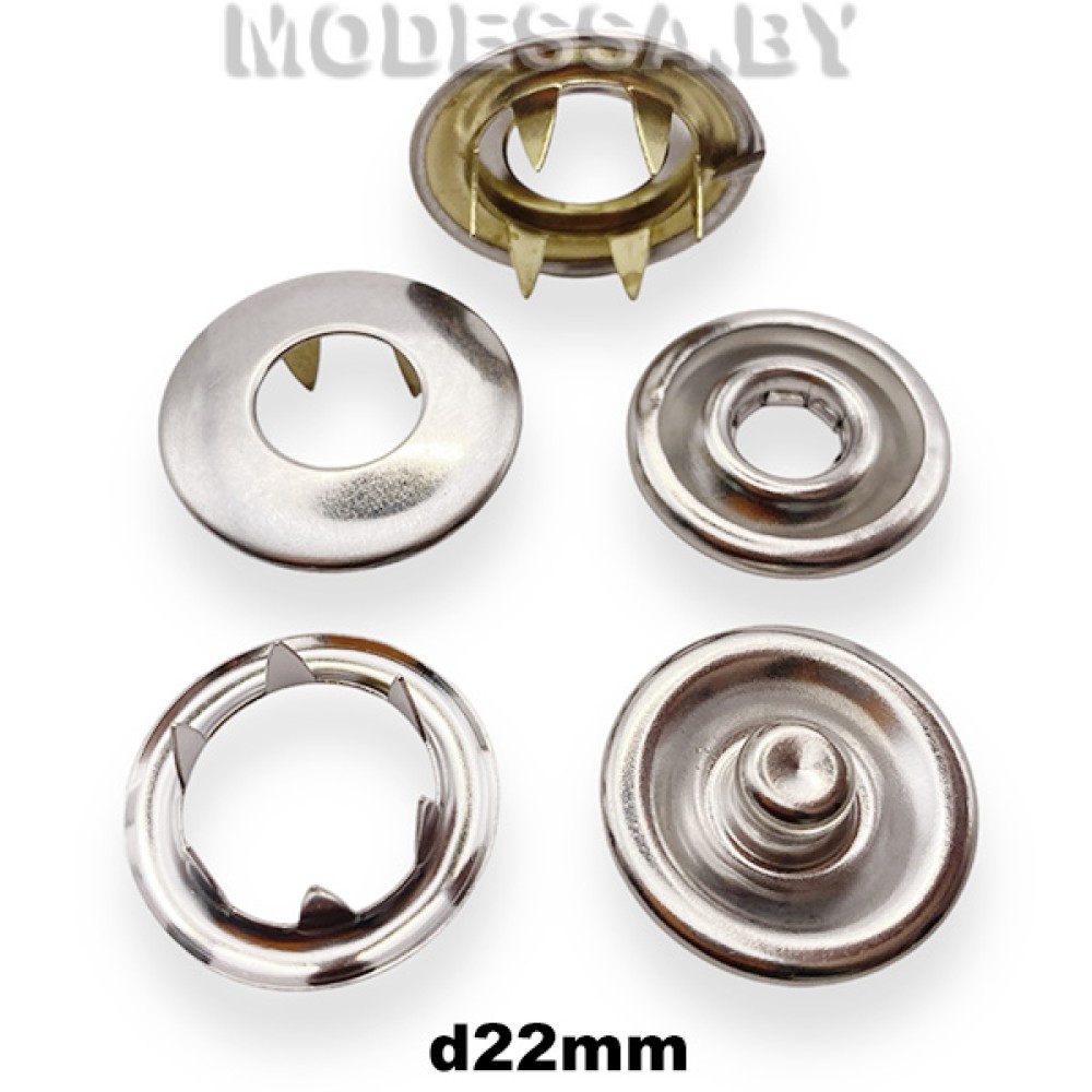 Кнопка клямерная металлическая d22мм. Кнопки имеют зубчики на обратной стороне основания, которые помогают крепить кнопку к ткани и предотвращают ее смещение. Кнопки используются в установке на тонкие ткани в легкой детской, женской или мужской одежде. Подходят для рубашек, блузок и т. д. Удобно и прочно застегиваются и расстегиваются. Для установки кнопок необходим специальный пресс с насадками, однако при этом отверстия в материале не пробиваются.