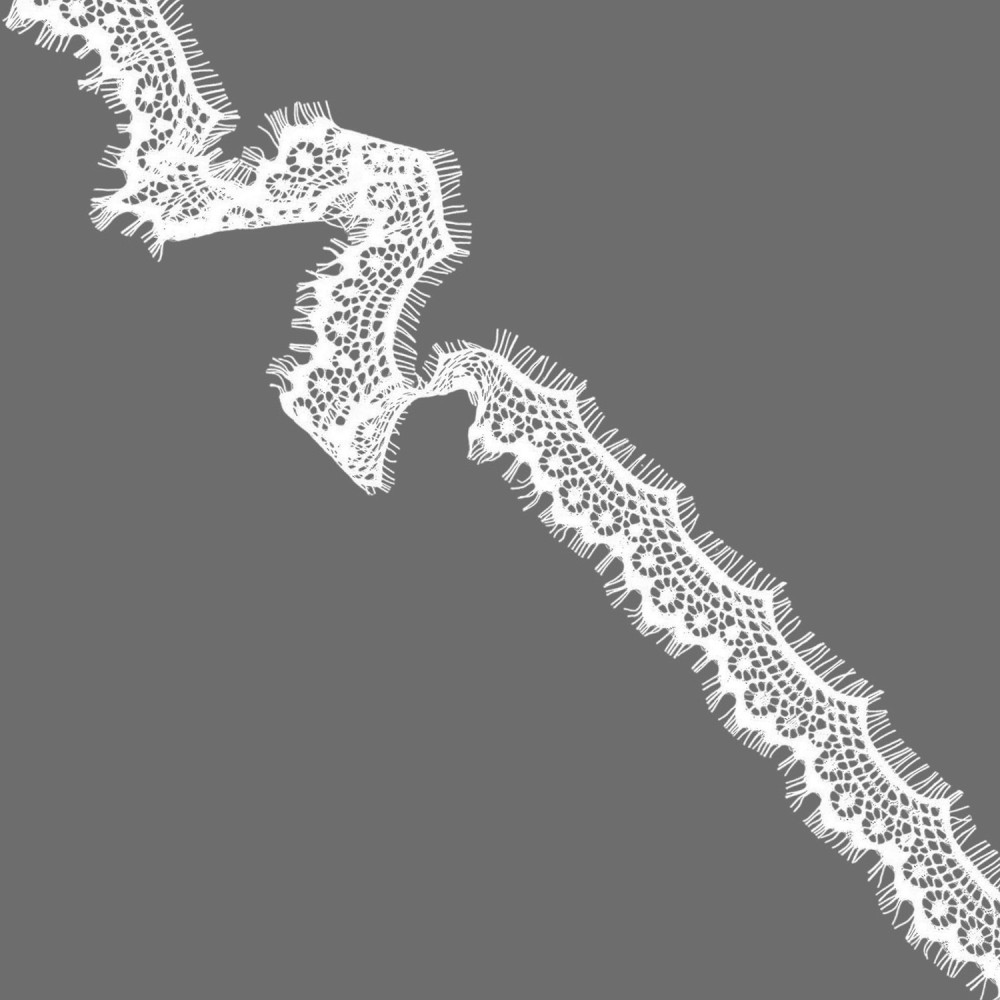 Кружево синтетическое с «ресничками», артикул: А 166. Ширина 60мм, длина 1 ленты — 3м. Кружево очень нежное, тонкое, воздушное, но в то же время прочное. Тянется лишь слегка за счёт переплетения нитей. Чаще всего применяется для украшения нижнего белья, отделки ночных рубашек, сорочек, также можно декорировать низ платьев, рукава и др.