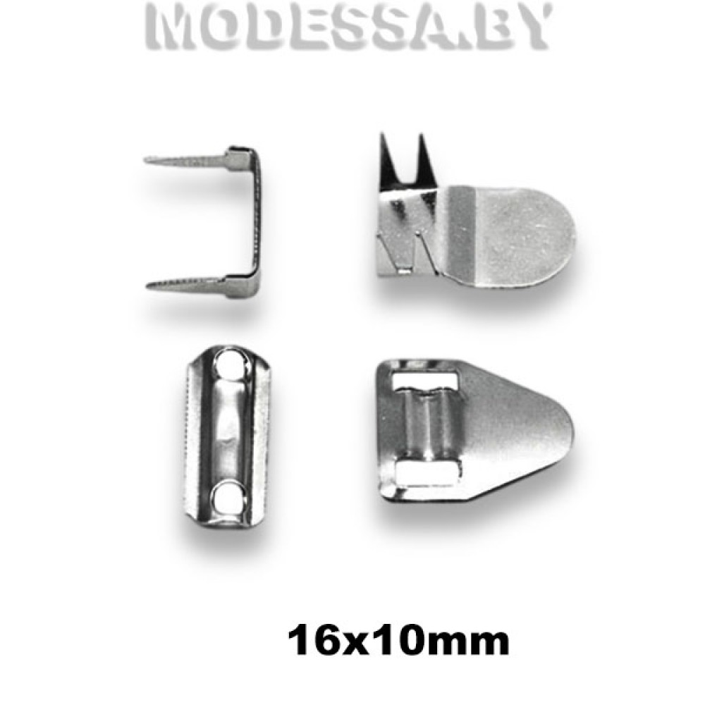 Крючок брючный металлический, артикул: CSC-38. Размер 16х10мм. Брючные крючки на прокол на 2 шипа – лучший выбор для изделий из плотных тканей, а также из нетканых материалов – замши, кожи. Не требуют пришивания, чтобы установить крючок, сделайте прокол на материале, вставьте крючок и загните шипы. Устанавливаются до окончания выполнения пояса. Крючки – удобный вариант, если крой брюк предполагает, что застежка будет не видна. В комплект входит металлическая петля и ответная часть.
