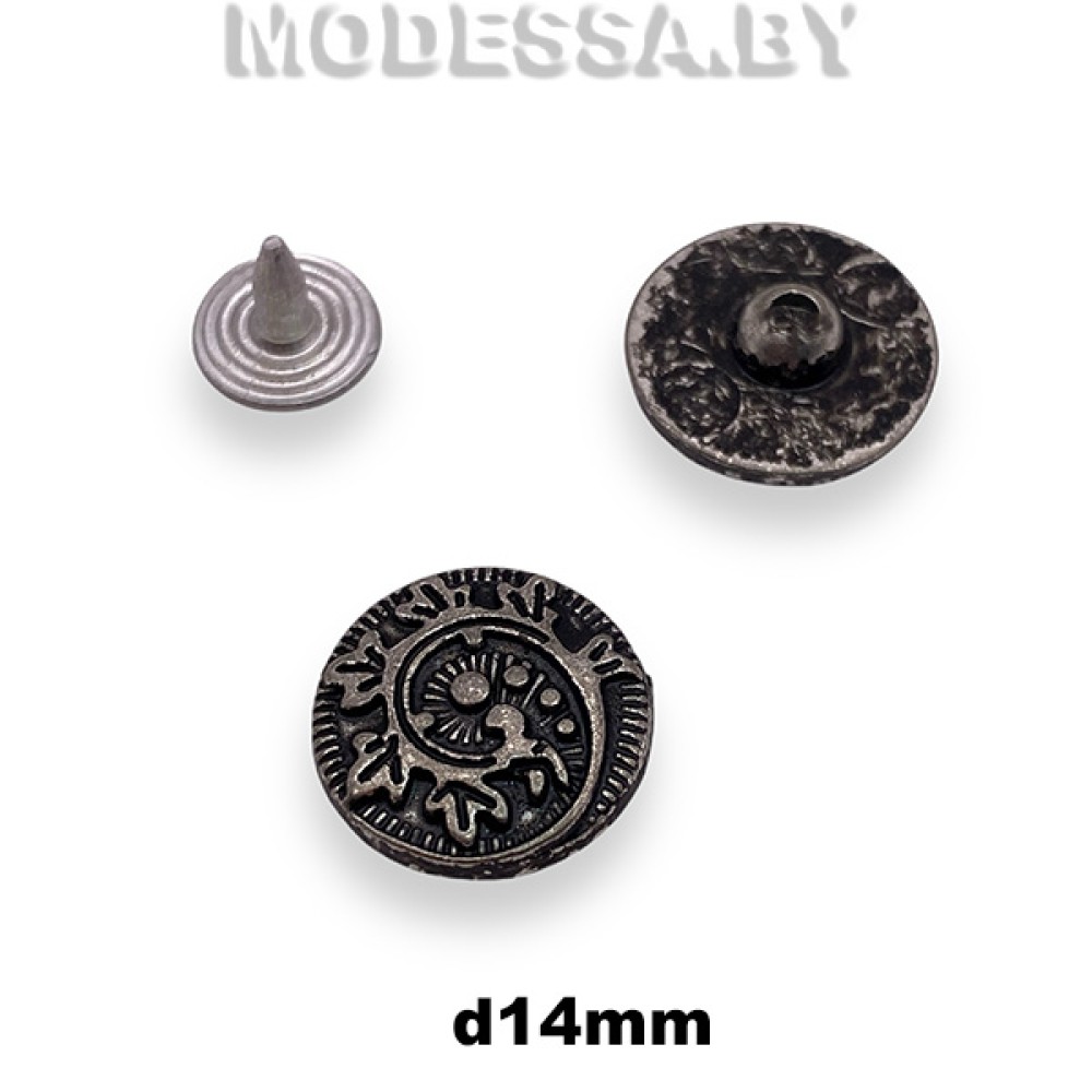 Заклёпка металлическая (хольнитен), артикул: 1400410.1. Диаметр 14мм. Металлическая заклёпка или хольнитен — это декоративный элемент, придающий изделиям дополнительную прочность. Позволяет надежно соединить ткань в местах, подвергающихся нагрузкам. Хольнитены используются для укрепления швов на одежде, особенно на джинсах, куртках, сумках и рюкзаках и т. д.