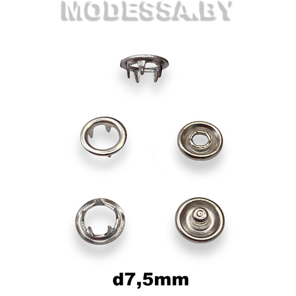 Кнопка клямерная металлическая d7.5мм. Рубашечные кнопки отличаются тем, что имеют небольшие зубчики на обратной стороне основания, которые помогают крепить кнопку к ткани и предотвращают ее смещение. Кнопки используются в установке на тонкие ткани в легкой детской, женской или мужской одежде. Подходят для рубашек, блузок, детских боди и т. д. Удобно и прочно застегиваются и расстегиваются. Для установки кнопок необходим специальный пресс с насадками, однако при этом отверстия в материале не пробиваются.