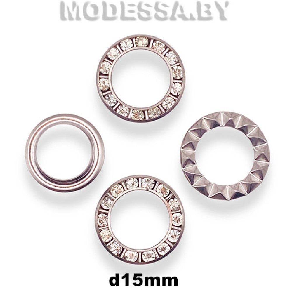 Люверсы металлические со стразами (блочки). Внутренний диаметр 15мм. Внешний диаметр 22мм. Высота ножки 5мм. Позволяют аккуратно оформить шнуровку и укрепить края отверстий для шнуровки, защитить их от трения. Подходят для поясов, а также создания шнуровки на верхней одежде, корсетах и других изделиях из плотных материалов. Установка люверса производится с помощью пресса и специальных насадок. Диаметром люверса называется внутренний диаметр отверстия в нем. Этот размер задается отверстием, которое необходимо получить.