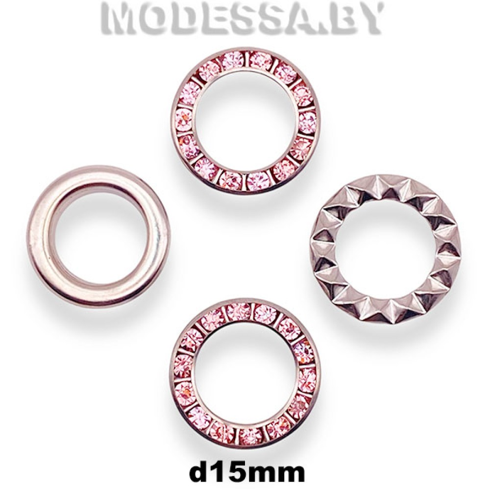 Люверсы металлические со стразами (блочки). Внутренний диаметр 15мм. Внешний диаметр 22мм. Высота ножки 5мм. Позволяют аккуратно оформить шнуровку и укрепить края отверстий для шнуровки, защитить их от трения. Подходят для поясов, а также создания шнуровки на верхней одежде, корсетах и других изделиях из плотных материалов. Установка люверса производится с помощью пресса и специальных насадок. Диаметром люверса называется внутренний диаметр отверстия в нем. Этот размер задается отверстием, которое необходимо получить.