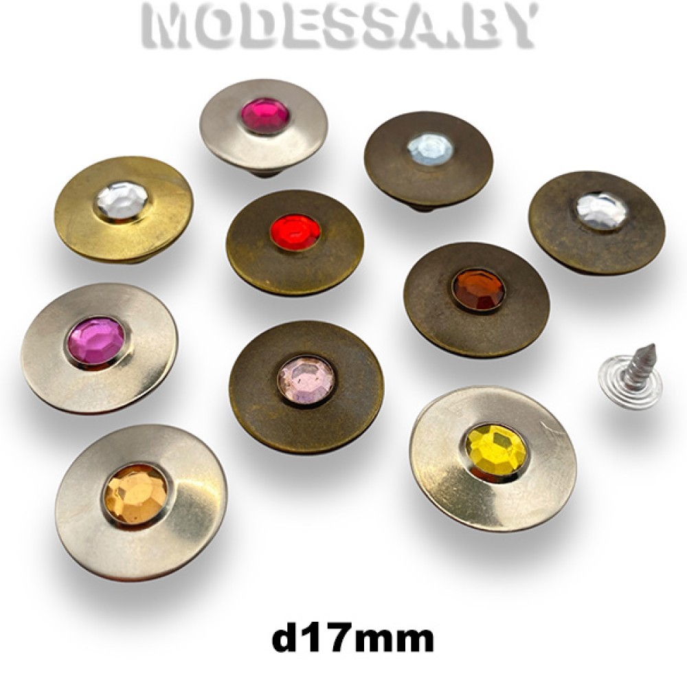 Заклёпка-пуговица металлическая со стразами, на фиксированной ножке, артикул: 1701609. Диаметр 17мм. Джинсовые пуговицы используются при изготовлении одежды и других изделий из джинсовой ткани. Данная пуговица будет эффектно смотреться как на одежде, так и на рюкзаке, сумке.