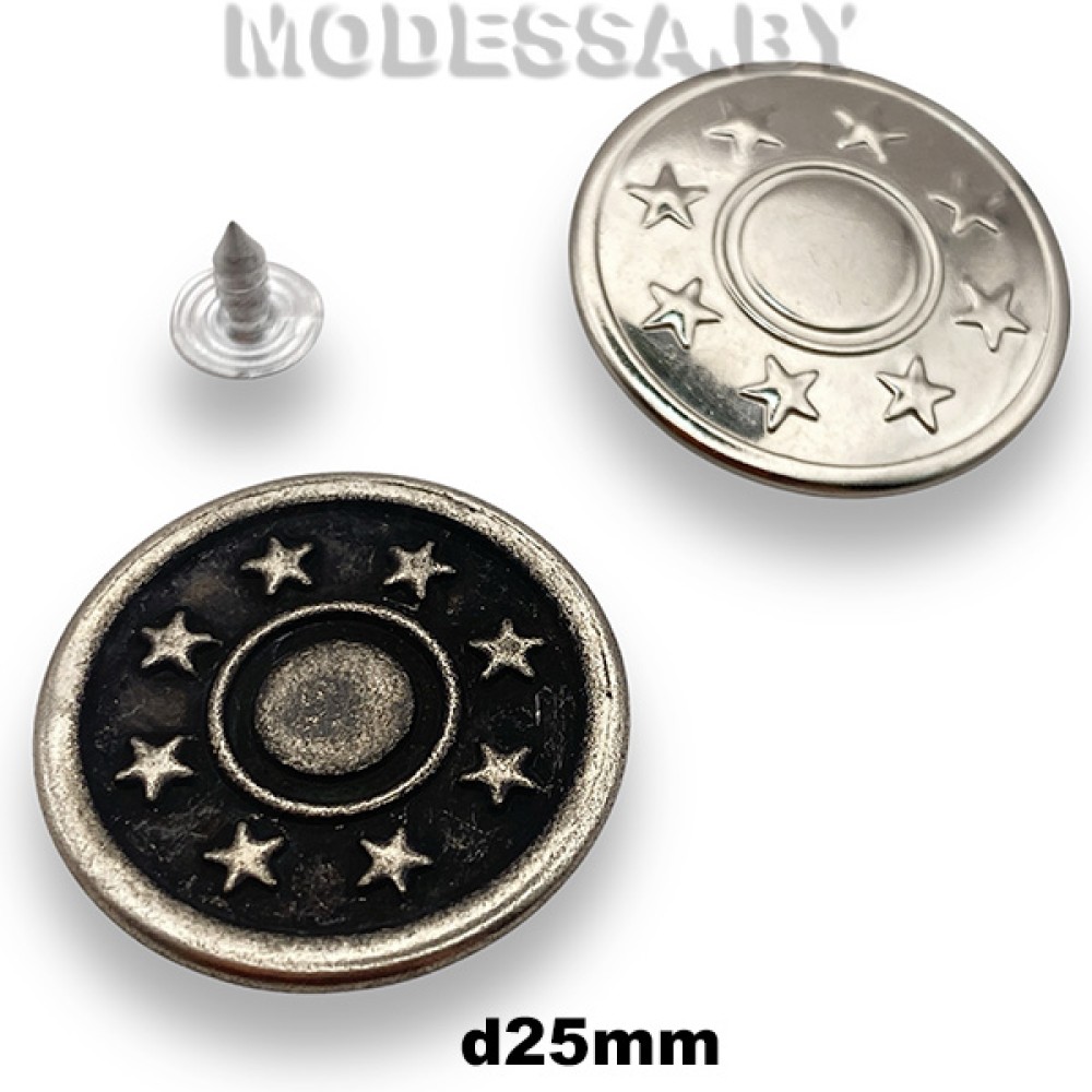 Заклёпка-пуговица металлическая, артикул: 2502515, на фиксированной ножке. Диаметр 25мм. Джинсовые пуговицы используются при изготовлении одежды и других изделий из джинсовой ткани. Данная пуговица будет эффектно смотреться как на одежде, так и на рюкзаке, сумке.