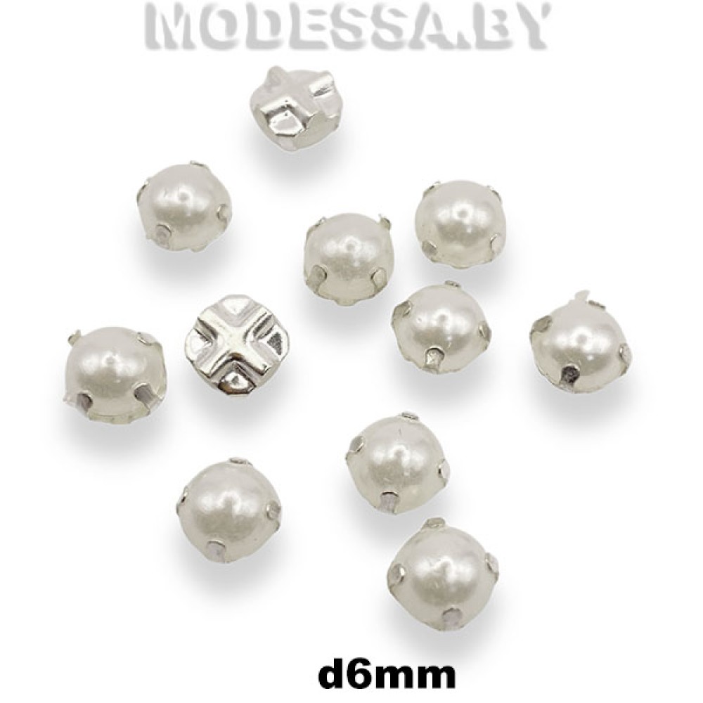 Стразы пластмассовые в металлической оправе круглой формы. Диаметр 6мм. Пришивные стразы под жемчуг прекрасно подойдут для декора одежды и аксессуаров. Крепятся к изделию путём пришивания металлической цапы, в которую вставлена жемчужина.