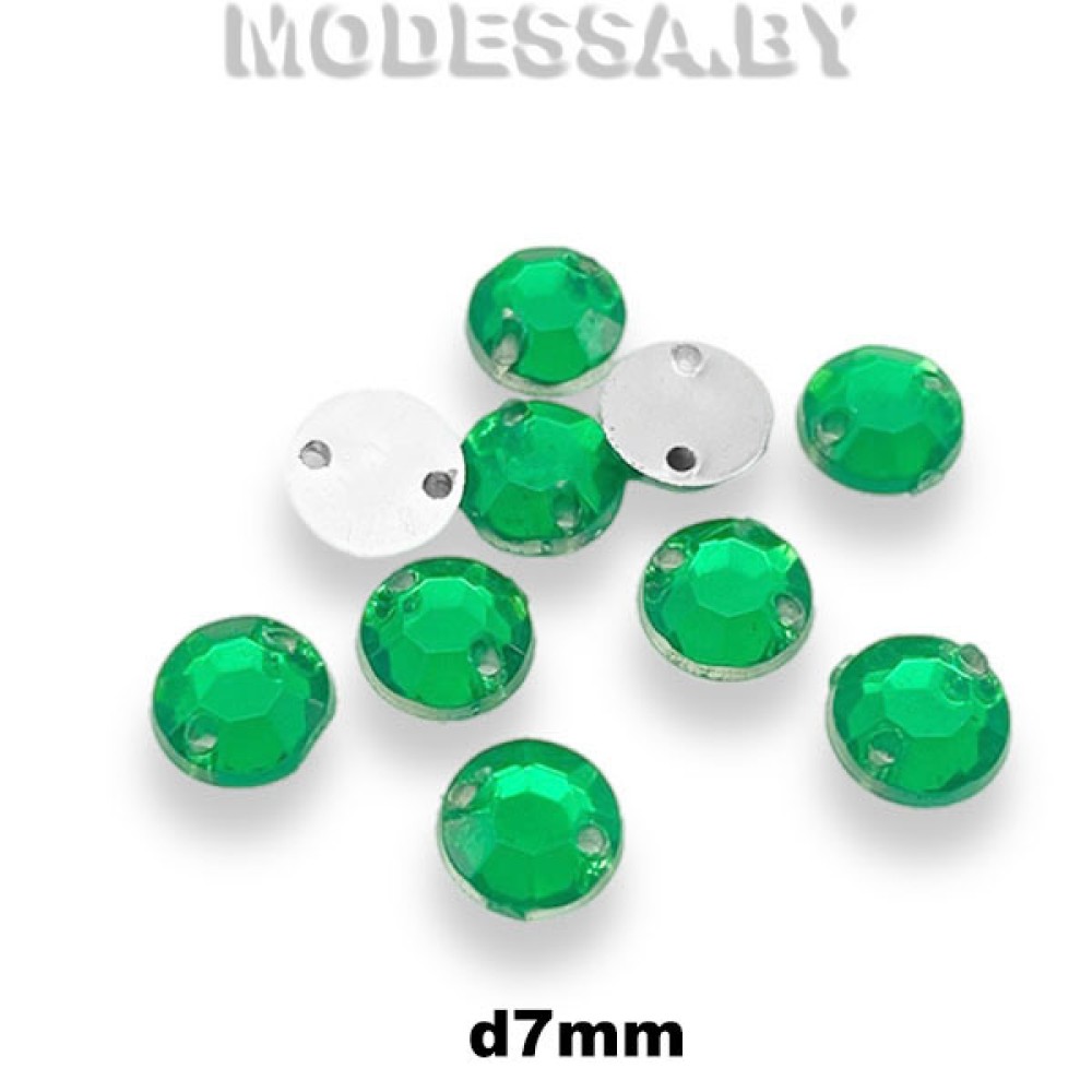 Украшение пластмассовое пришивное круглой формы. Диаметр 7мм. Украшение с двумя отверстиями и плоским дном используется для украшения одежды, обуви, сумок, для декорирования предметов интерьера, творческих поделок и др.