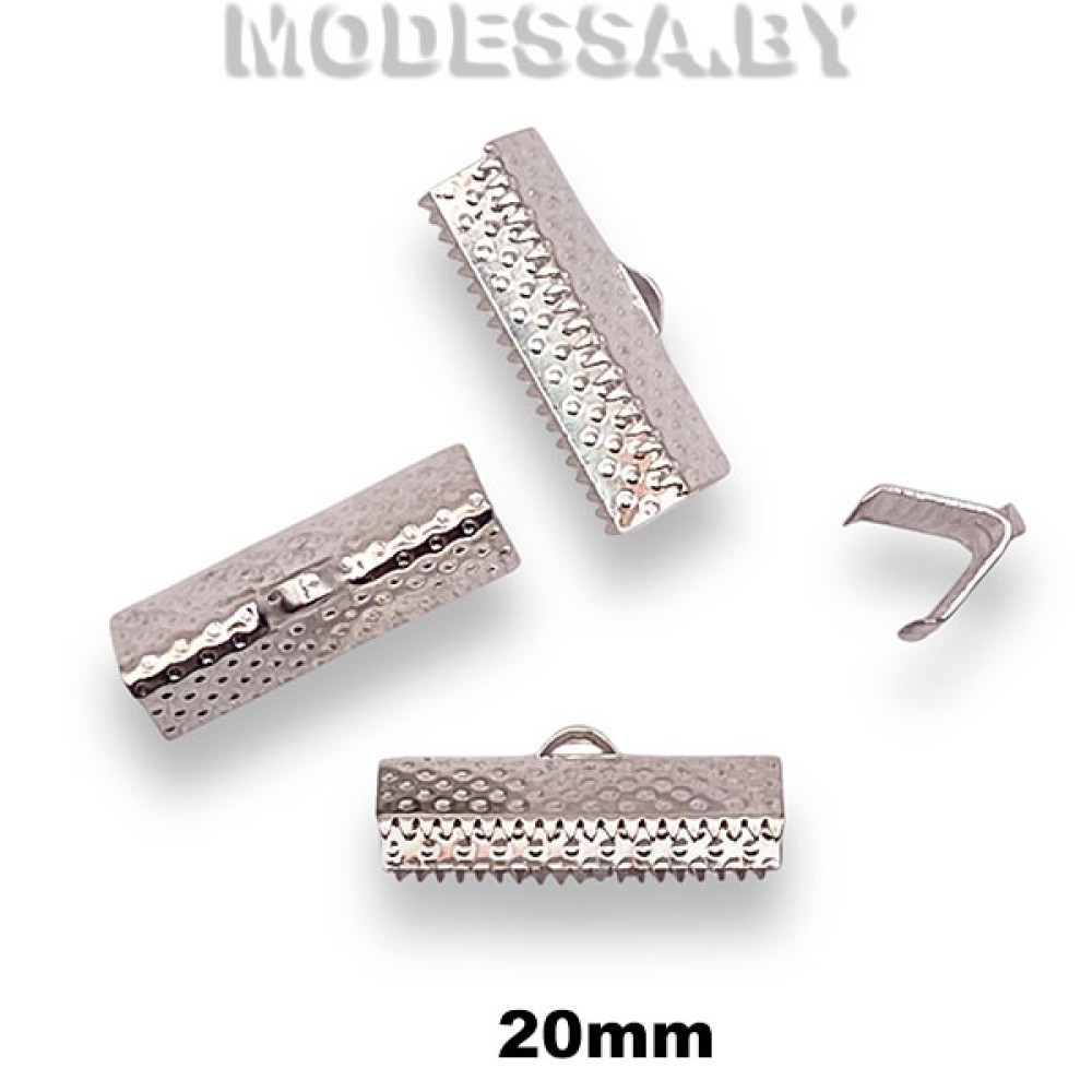 Зажим для лент металлический. Размер 20х6мм. Используется для аккуратного завершения бус, колье или браслетов. Зажимы позволяют подготовить концы украшения к присоединению застежки. Зажимаются с помощью инструментов, а к петельке зажима присоединяется застежка напрямую или при помощи соединительного колечка.