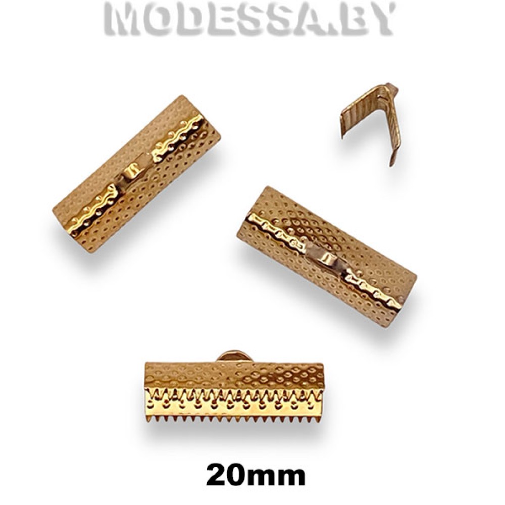 Зажим для лент металлический. Размер 20х6мм. Используется для аккуратного завершения бус, колье или браслетов. Зажимы позволяют подготовить концы украшения к присоединению застежки. Зажимаются с помощью инструментов, а к петельке зажима присоединяется застежка напрямую или при помощи соединительного колечка.