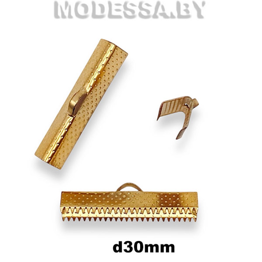 Зажим для лент металлический. Размер 30х6мм. Используется для аккуратного завершения бус, колье или браслетов. Зажимы позволяют подготовить концы украшения к присоединению застежки. Зажимаются с помощью инструментов, а к петельке зажима присоединяется застежка напрямую или при помощи соединительного колечка.