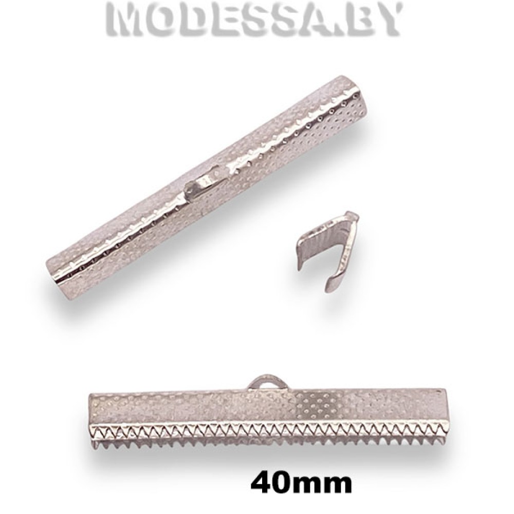 Зажим для лент металлический. Размер 40х6мм. Используется для аккуратного завершения бус, колье или браслетов. Зажимы позволяют подготовить концы украшения к присоединению застежки. Зажимаются с помощью инструментов, а к петельке зажима присоединяется застежка напрямую или при помощи соединительного колечка.