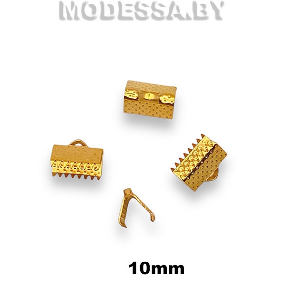 Зажим для лент металлический. Размер 10х6мм. Используется для аккуратного завершения бус, колье или браслетов. Зажимы позволяют подготовить концы украшения к присоединению застежки. Зажимаются с помощью инструментов, а к петельке зажима присоединяется застежка напрямую или при помощи соединительного колечка.